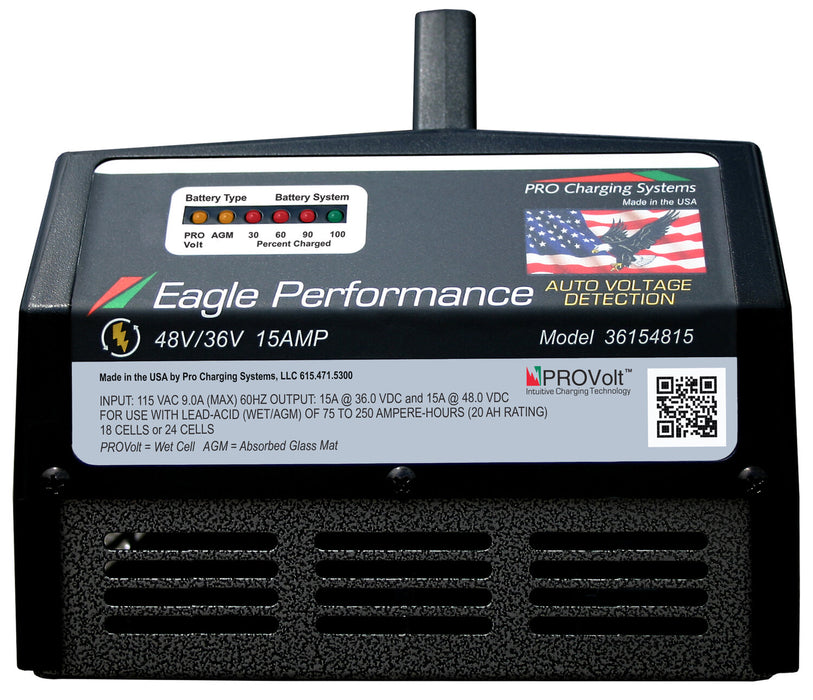 This charger automatically detects the appropriate voltage for your system - either 36 volts or 48 volts and charges at 15 amps. It supports AGM batteries and uses the Dual Pro PROVolt™ Intuitive 5 Stage Charge Technology to ensure the best performance and optimum battery life.