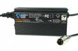 This charger provides a standard charge cycle, which applies higher voltage when the battery is lower, and lower voltage as the battery is close to being fully charged. It can be connected to the battery indefinitely without harm to the battery or charger. The charger comes with an XLR three-prong connector, commonly used with mobility scooters.