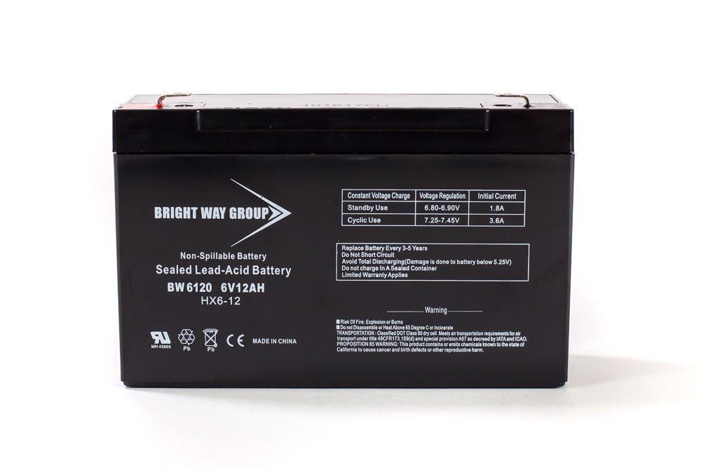 The Bright Way Group BW 6120 F2 is a 6-volt 12Ah sealed lead-acid battery that is brand new and ready to replace your existing battery (regardless of the original manufacturer).
