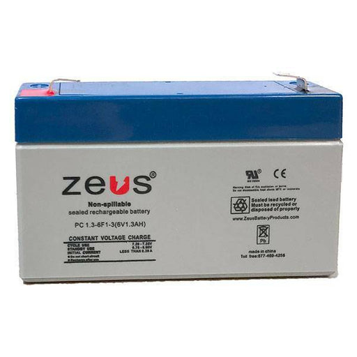 The Zeus Battery PC1.3-6F1 is a 6-volt 1.3Ah sealed lead-acid battery that is brand new and ready to replace your existing battery (regardless of t...
