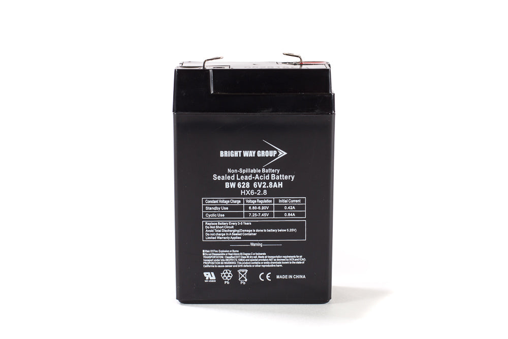 The Bright Way Group BW 628 is a 6-volt 2.8Ah sealed lead-acid battery that is brand new and ready to replace your existing battery (regardless of the original manufacturer).